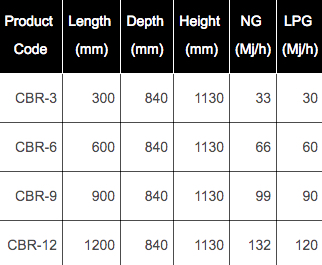 The cooking surface consists of heavy duty cast iron grates with special drainage channels, which direct fat to the grease trough located at the front of the unit. A cast-iron hood placed above the 34 Mj burners radiates heat evenly across the grates, creating an ideal surface for grilling.