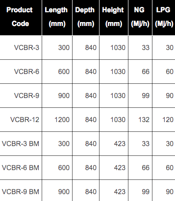 - 33MJ stainless steel burner and two radiant hoods per 300mm section